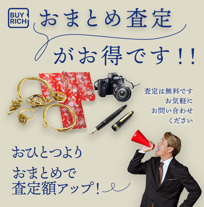 少しでも高く売りたい!というお客様のご希望に、バイリッチは専門鑑定士の無料査定・最新相場の高価買取価格でお答えします。